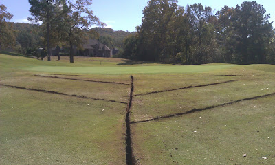 Late yesterday afternoon, we discovered that we will need to replace 2 more sections (40') of pipe. Those 2 sections will extend us past the cart path, which means that we will now have to remove approximately 35' of the path and re-pour it when finished. We will also now have to contend with the irrigation main line as well. We are hopeful that we will be able to complete the pipe installation by late tomorrow afternoon and begin backfilling the trench with dirt and cleaning up immediately afterwards.